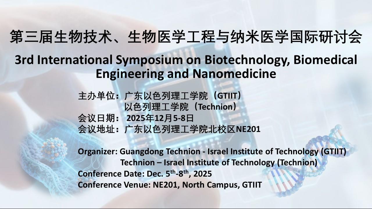 To foster high-level scientific collaboration and capacity building, and to lay the foundation for international strategic partnerships, the Guangdong Technion-Israel Institute of Technology (GTIIT) will host the 3rd International Symposium on Biotechnology, Biomedical Engineering, and Nanomedicine from December 5–8, 2025 in Shantou, Guangdong.The conference will feature over 30 invited speak...