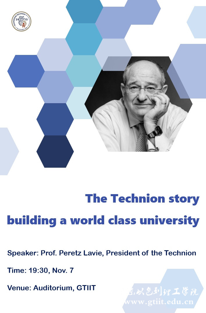 //Lecture Schedule//Topic: The Technion story - building a world class universitySpeaker: Prof. Peretz Lavie, President of the TechnionTime: 19:30, Nov. 7Venue: Auditorium, GTIITPresident Peretz Lavie received his formal training in Sleep research and Sleep medicine at the University of Florida and at the University of California San Diego, and was a visiting professor at Harvard University in Bos...