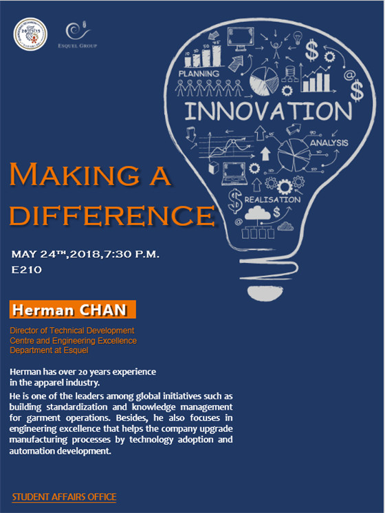 You are invited to the lecture- Making a Difference given by Herman Chan and Cai Wei.Speaker:Herman Chan : Director of Technical Development Centre and Engineering Excellence Department at EsquelCai Wei : Deputy General Manager of Yang Mei Garment FactoryTime: 19:30, May 24, 2018, ThursdayVenue: E210Herman Chan has over 20 years’ experience in the apparel industry. He has been moving from an indus...