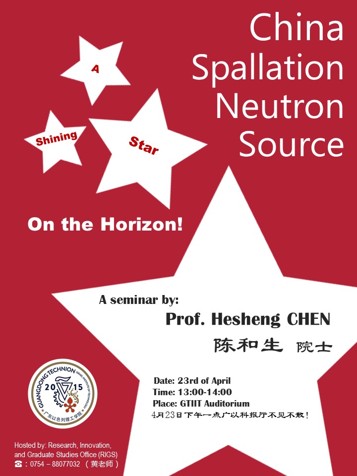 Speaker: Hesheng Chen (Inst. of High Energy Physics, Beijing)Date:     Monday, April 23, 2018Time:     13:00-14:00Venue:    Auditorium, GTIITAbstract:The China Spallation Neutron Source (CSNS) is a multidiscipline research platform with neutron scattering. The neutron scattering provides powerful research tool for material sciences and engineering, physics, chemistry, life sciences, energy and res...