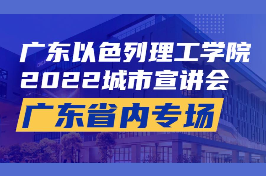 广东以色列理工学院2022城市宣讲广东省专场2022.4.30-5.44月30日-5月4日广东以色列理工学院广东省城市宣讲全面展开5天内10城包括:广州、深圳、佛山、东莞、珠海、中山、江门、揭阳、潮州和汕头大学领导带队的广以宣讲天团将带来最权威、最有料的招生宣讲全面剖析2022广以办学特色、招生新政现场为考生及家长答疑解惑这个五一假期,让广以成为您最靓丽的风景线!长按下方图片可扫码报名,同时可另存为手机图片,方便随时...