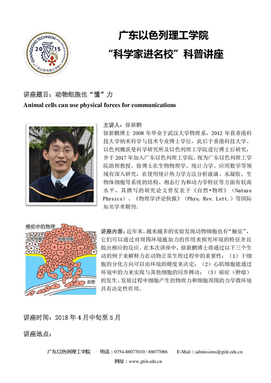 一年一度的广东以色列理工学院“科学家进名校”科普讲座系列拉开帷幕啦! 有兴趣的同学可关注我们官网官微的最新消息推送! 日期:4月23日时间:16:40 - 17:20地点:深圳龙成高级中学演讲主题:Animal cells can use physical forces for communications主讲人:徐新鹏教授  近期讲座活动安排如下(持续更新): 日期:4月22日时间:8:00 - 17:00活动:...