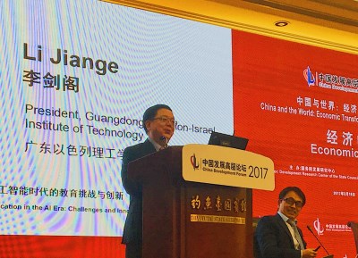 3月18日,广东以色列理工学院校长李剑阁应邀参加由国务院发展研究中心主办的“中国发展高层论坛2017年会”,并在 “人工智能时代的教育挑战与创新”环节发表了演讲。“中国发展高层论坛2017年会”是今年“两会”后首个国家级大型国际论坛,是中国政府高层领导、全球商界领袖、国际组织和中外学者之间重要的对话平台。本届论坛的主题是:“与世界对话,谋共同发展”。在演讲中,李剑阁首先向在场嘉宾和观众介绍了广东以色列理工学...