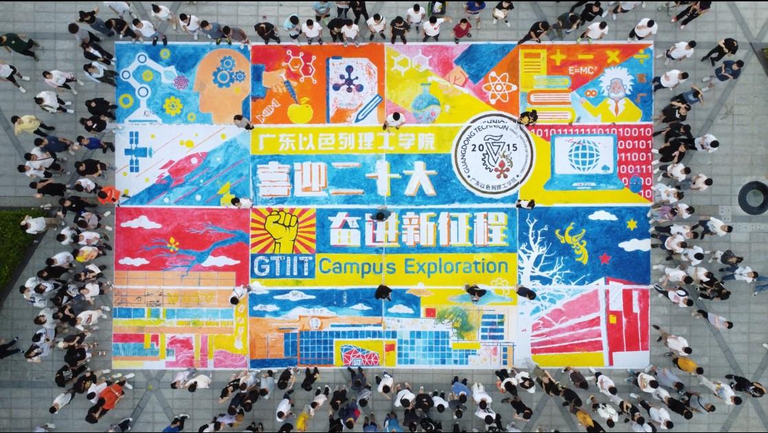 为迎接党的二十大胜利召开,广东以色列理工学院2022级新生用创意绘制斑斓画卷,合力完成一幅长17米、宽10米的彩色巨画,用筑梦之笔向党的二十大深情献礼。巨画由16组作品拼接而成,画作融合广以特色,如访客与创新中心、教学楼、实验楼等建筑轮廓,以及实验仪器、物理公式等图案。科学与美学不期而遇,理工科元素与绘画艺术完美结合,生动立体地呈现了期盼喜庆的氛围。广以学子们挥洒手中的画笔,团结协作共同绘制创意巨画,展示出理工科学子...