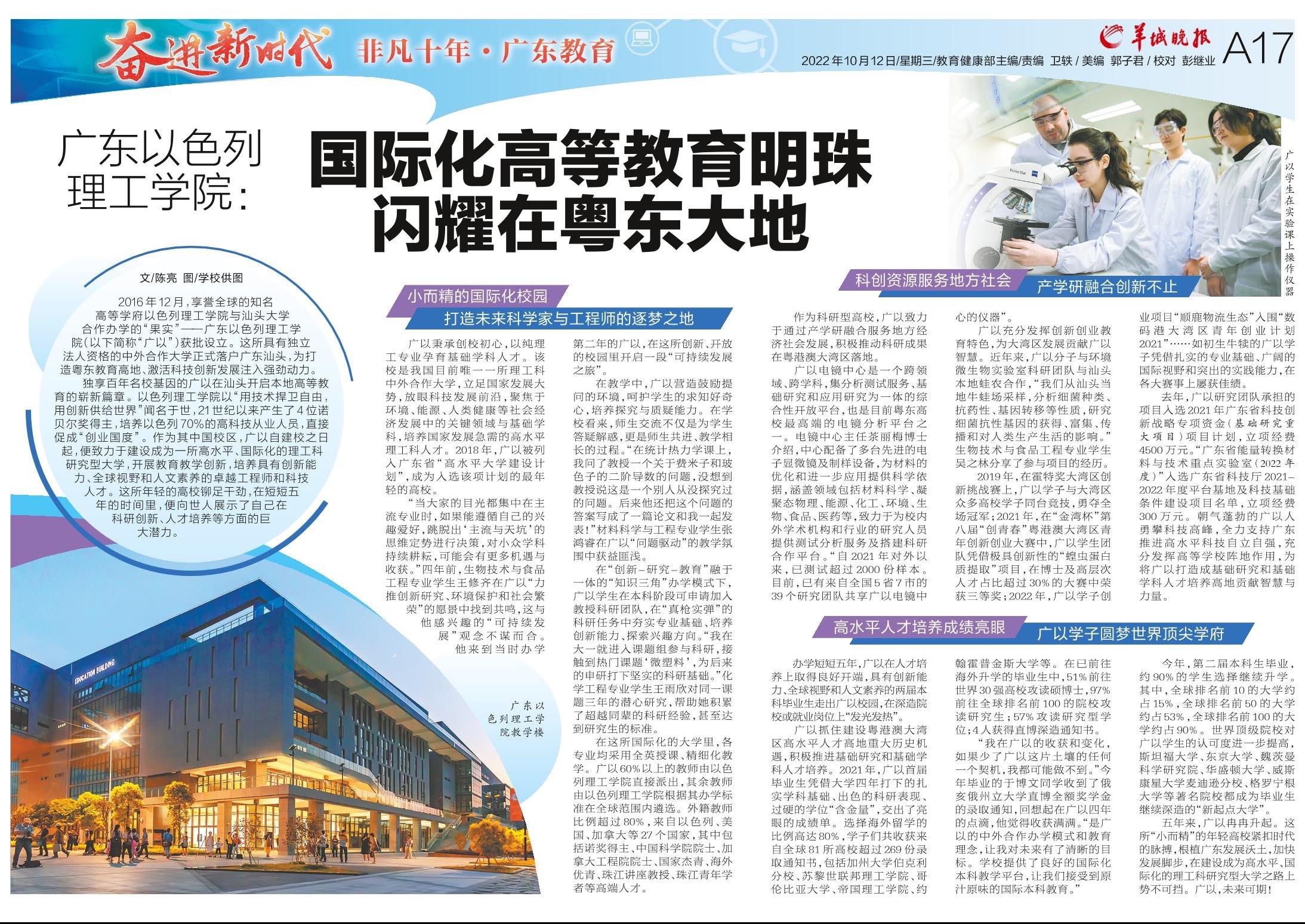 10月12日,《羊城晚报》在“非凡十年·广东教育”大型系列报道中刊发了《广东以色列理工学院:国际化高等教育明珠闪耀在粤东大地》。报道聚焦广以建校五年来,在发挥理工科院校特色、培养国际化高水平人才、推进产学研深度融合等方面的进展与成果,肯定了广以在打造粤东教育高地、助力区域优质教育发展的积极贡献。羊城晚报2022年10月12日A17版报道报道指出,小而精、国际化的广以校园是打造未来科学家与工程师的逐梦之地。独享以色列理...