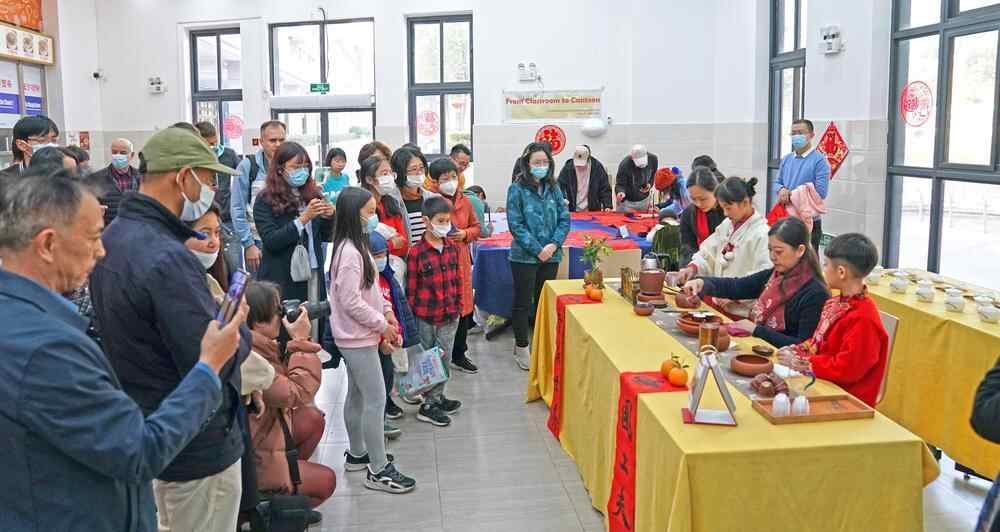 激昂的锣鼓声逐渐临近,浮西龙狮团舞入广以北校区,舞狮队员们时而奔跑跳跃,时而休息、思索,活灵活现惟妙惟肖,这是汕头非遗项目——南枝醒狮,这支舞狮队也是潮汕地区规模最大、影响最广的醒狮队伍;茶烟一缕轻轻扬,搅动兰膏四座香,汕头市工夫茶艺市级非遗传承人、汕头市潮汕茶叶研究院院长张虹为大家展示潮汕工夫茶艺表演,师生们共同品味底蕴深厚的潮汕茶文化;荣获粤菜师傅星级认定的汕头市技师学院烹饪系特聘教师黄光延为大家展示潮汕春节特色小吃,师生们共品咸香清甜的“炸菜头丸”,为新年图个“好彩头”,尝一口香甜软糯的“羔烧什锦”,希冀来年甜蜜美满……