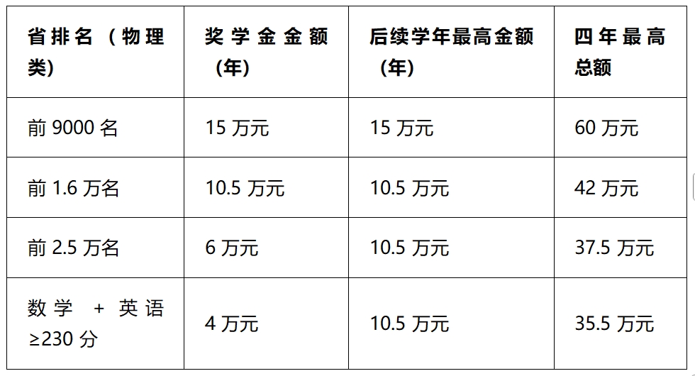 新生入学奖学金:广东省物理类前9000名可获60万元全额资助。