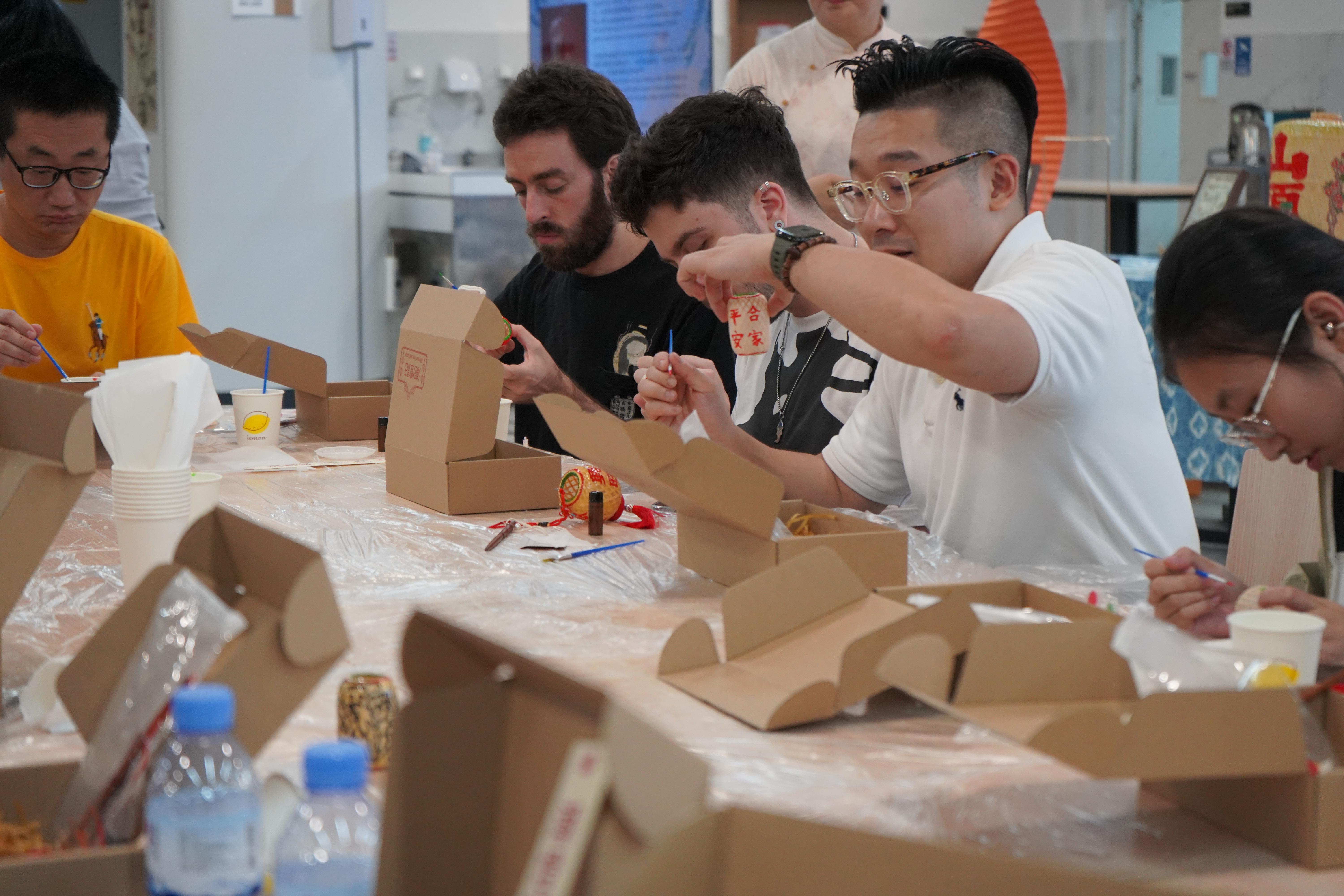 在月饼烤制的间隙,一场妙趣横生的潮汕油纸灯笼DIY绘制活动火热开场。广以的中外师生们在潮汕油纸灯笼制作老师的细致讲解和悉心指导下,沉浸式探寻潮汕油纸灯笼背后的文化内涵、学习其制作技艺的关键要点。