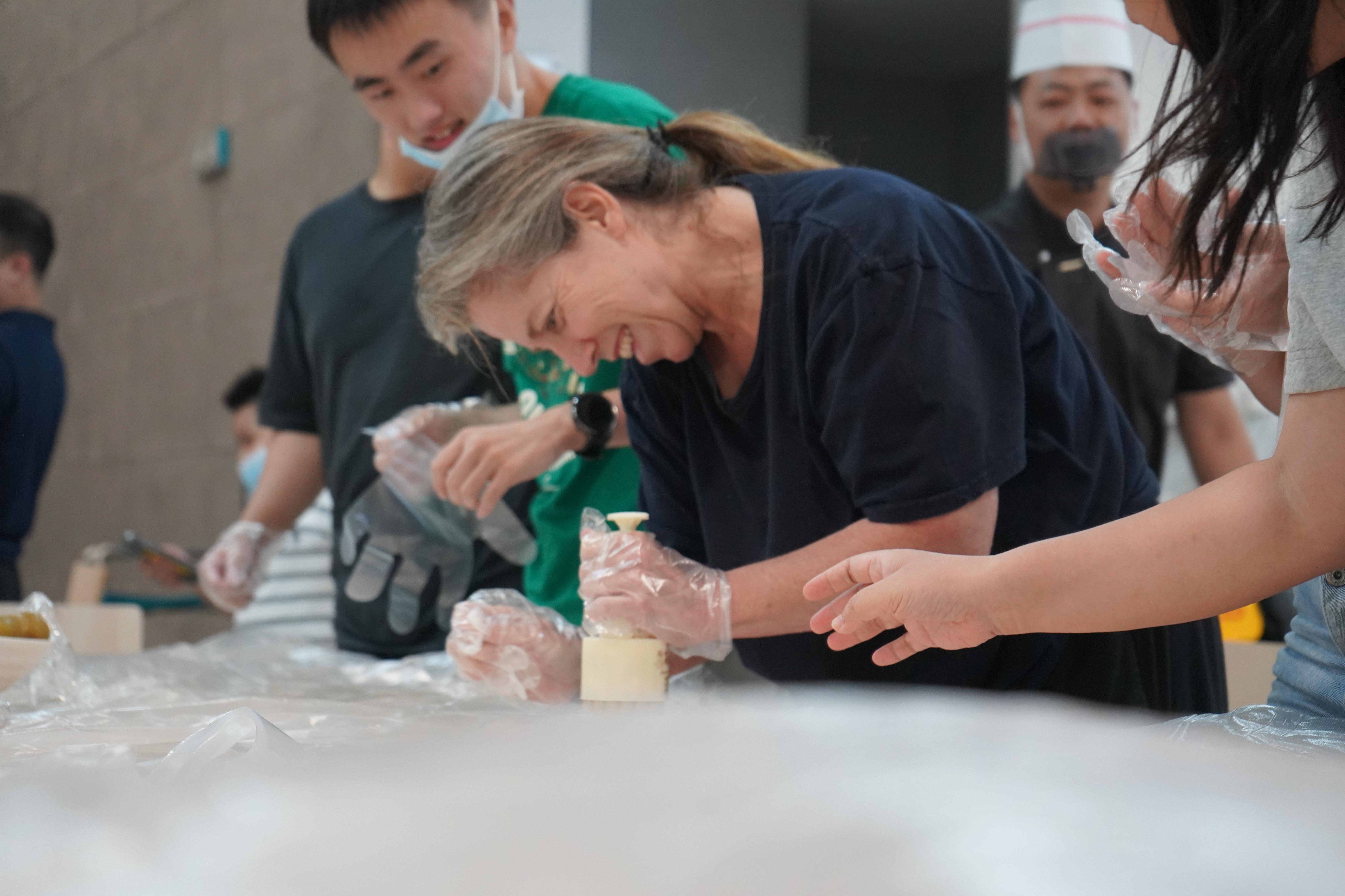 点心师傅们示范后,中外师生纷纷“撸起袖子”上手实践。捏、压、卷、包……不一会儿,一个个饱满的月饼便在巧手中诞生。尽管都是学术领域的佼佼者,但做月饼对他们来说却是个新挑战,不少人在多次摸索中才终于完成制作出满意的月饼。