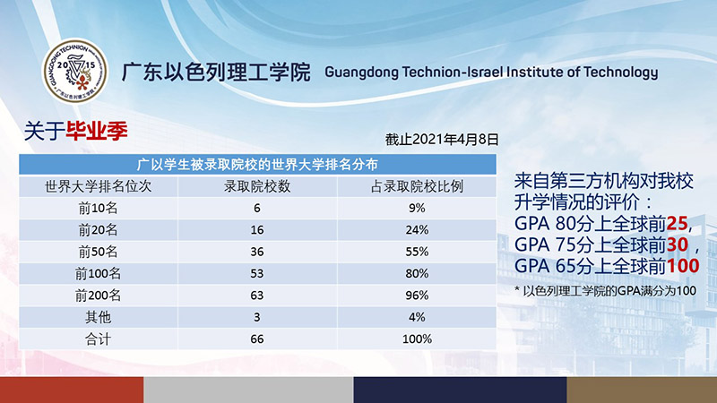 截至4月初,广以学生收到来自约翰霍普金斯大学、哥伦比亚大学、康奈尔大学、加州大学伯克利分校、加州大学洛杉矶分校、苏黎士联邦理工学院、洛桑联邦理工学院、以色列理工学院、香港科技大学、新加坡国立大学、伦敦国王学院、伦敦大学学院等学校的研究生项目录取通知书约150份。