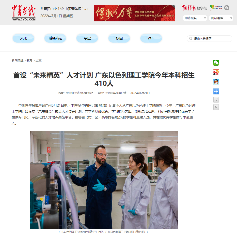 《中国教育报》专访报道广东以色列理工学院:用100%的努力追逐科技创新