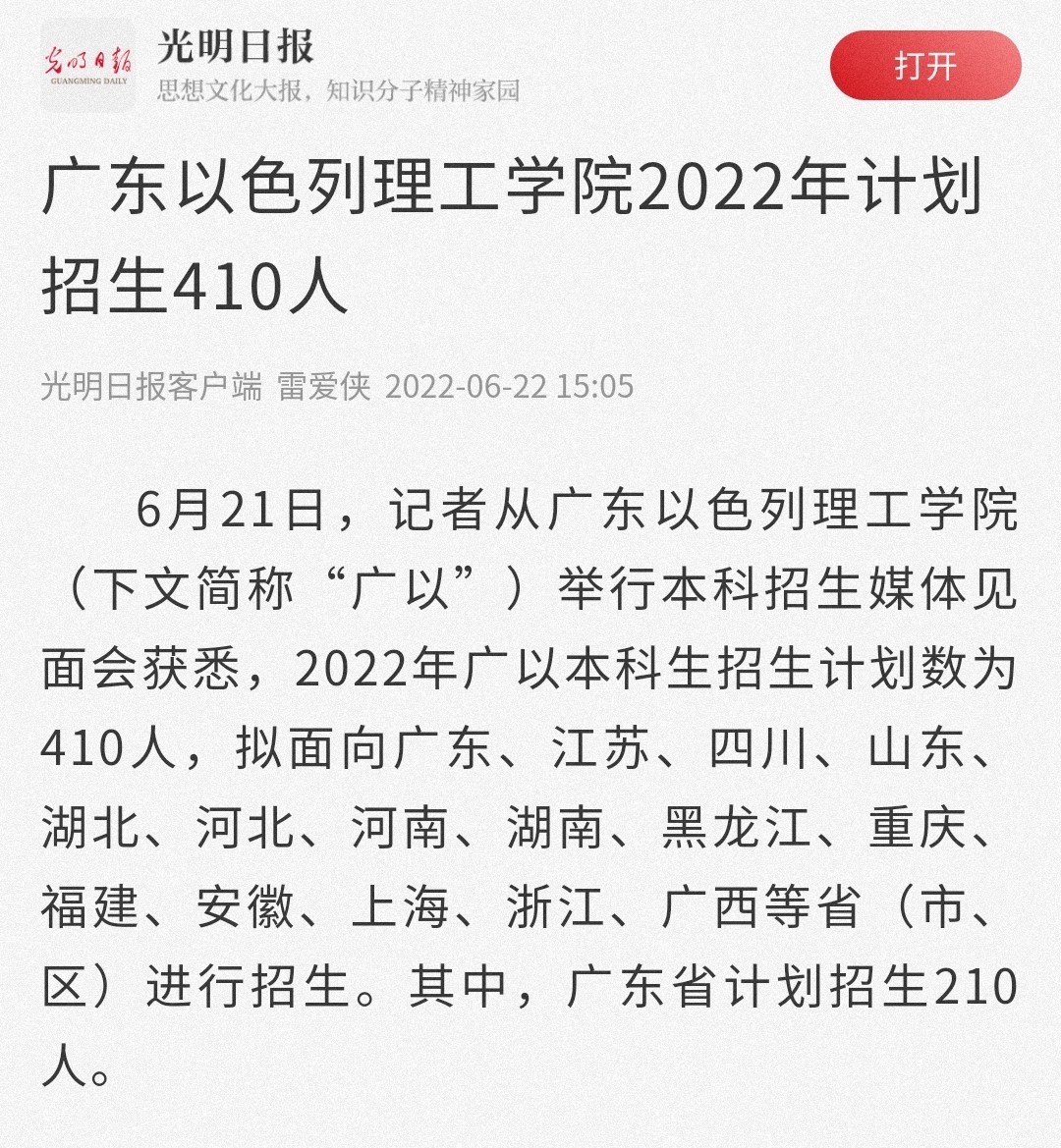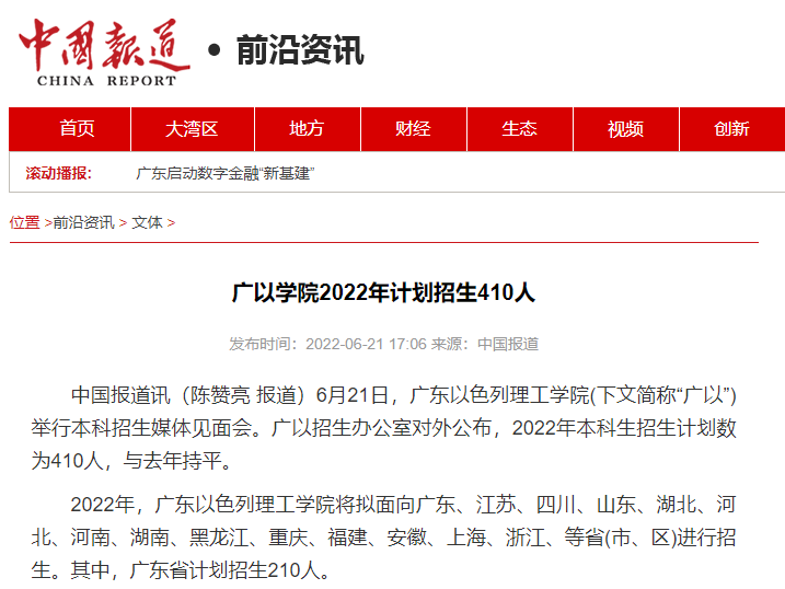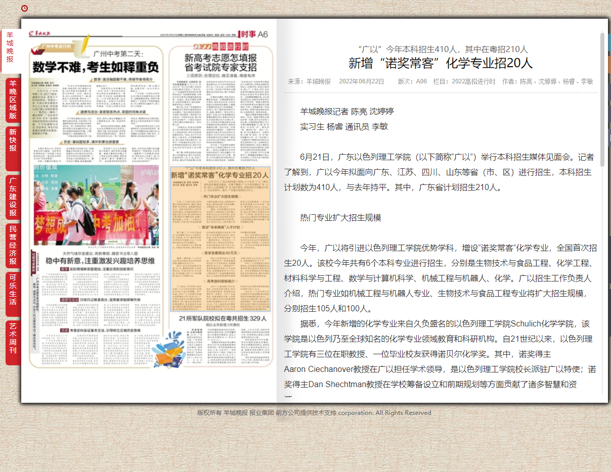 6月21日,广东以色列理工学院2022年本科招生媒体见面会在广州举行,中新社广东分社、光明日报广东站、人民日报数字广东、中国青年报、中国科学报、中国教育在线、中国报道、南方日报等多家国家级、省级媒体对广以的学校建设、人才培养、招生政策等情况进行报道。