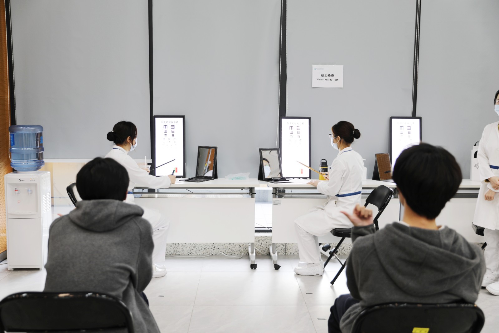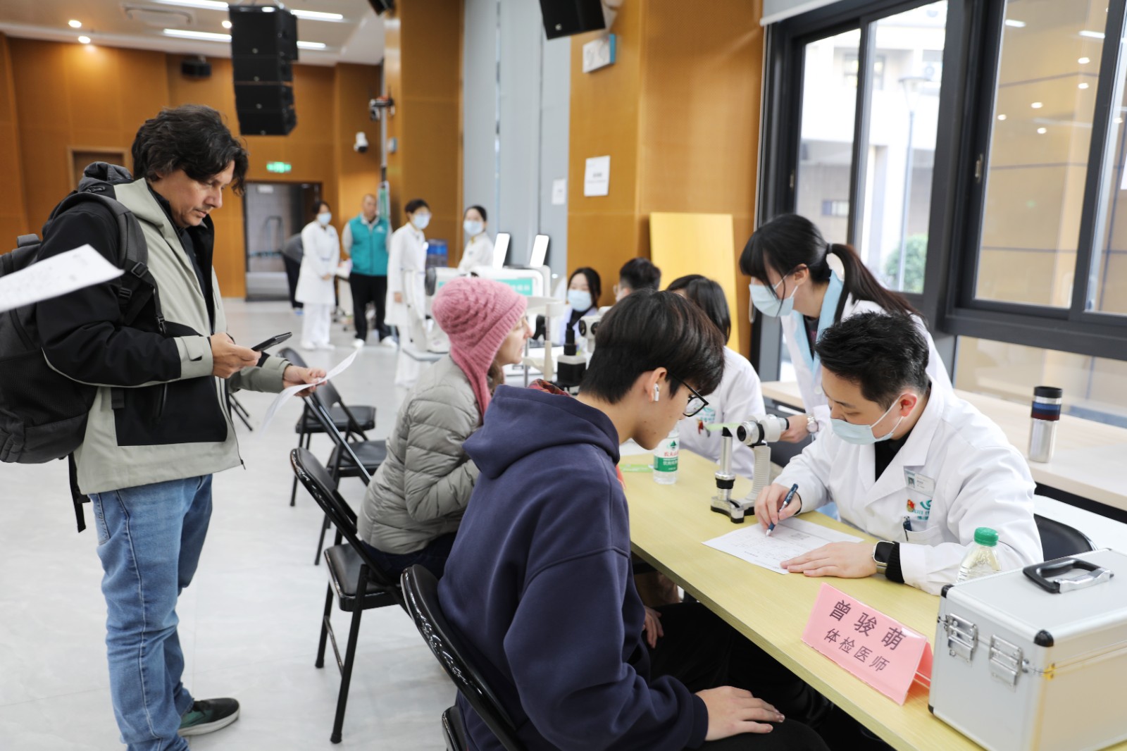眼科检查区内,医生为师生进行视力检测、眼部基础检查,细致排查干眼症、视疲劳等常见问题,并结合电子设备使用习惯,提出科学护眼建议。